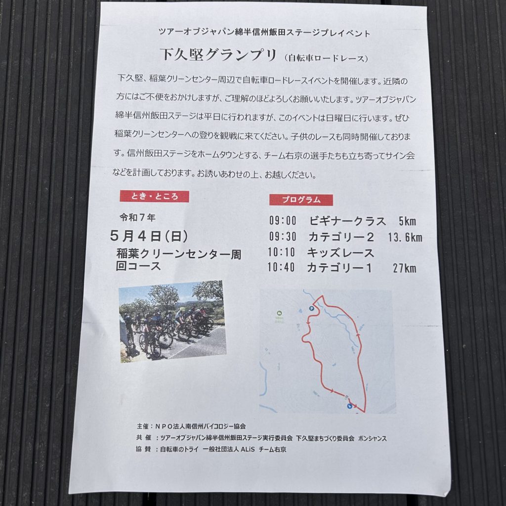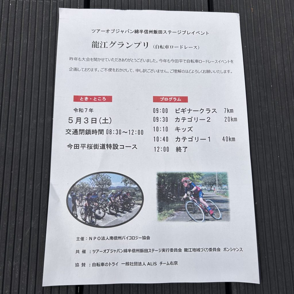 BLOG ゴールデンウィーク3days ロードレース ツアーオブジャパン綿半飯田ステージプレイベント By BRILLER CYCLING 2025-04-10 2025-04-10 ツアーオブジャパン綿半飯田ステージプレイベント 一般の方が参加出来るロードレースが、ゴールデンウィークに3DAYSで開催されます。5/3(土) 龍江グランプリ 平坦コース5/4(日) 下久堅グランプリ 登りコース5/5(月) 大鹿村大西グランプリ アップダウンコース ロードレースに初めて参加される方のビギナークラス、キッズクラスなどもありますので、是非チャレンジしてみてはいかがでしょうか! すでに定員のクラスもあるようですので、早めにエントリーを‼︎ https://msenduro.hatenablog.com/?fbclid=IwZXh0bgNhZW0CMTEAAR7HDlO_D5a3wFHGR38BCuZvvT7gKyO9lBlxC7UfMdmqHwoTOsQK9yR0YhIlQA_aem_tlcec28187loJs8HZ0VN7g 4月13日(日) SUNDAY RIDE 「みんなが知らない道と激坂」開催します! /長野県/飯田市スポーツバイク自転車店 自転車のワールドツアーチームLOTTOが使用する電解質サプリメント「PRECISION」が日本初上陸! 長野県/飯田市/スポーツバイク自転車店