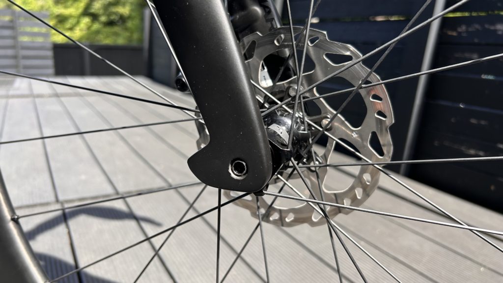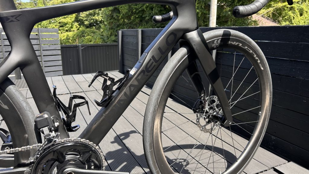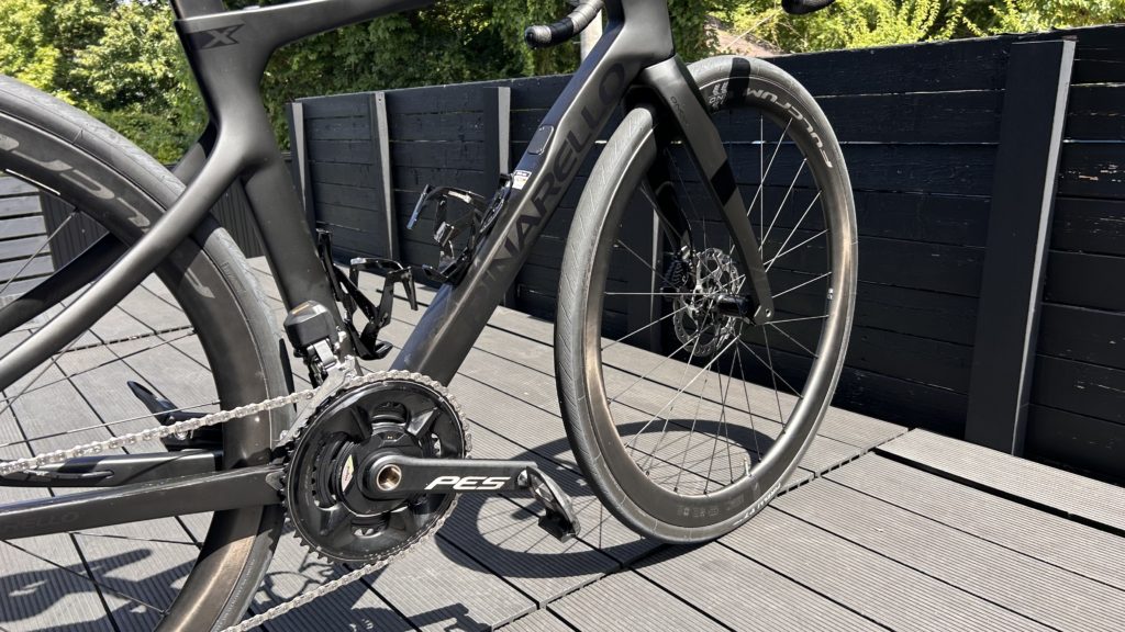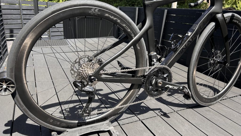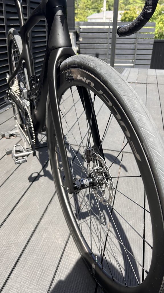 ホイールはフレームに合うようにフルクラムWIND42にグレードアップ。内幅23mmワイドリムで32mm幅のタイヤとの相性も良かったです。Xはフロントフォークが超ワイドスタンスで、空力の良さも私は感じました。エアロディスクロードは下りのスピードも出るので、ホイールのバランス取りも行って、ハイスピードで不安定にならないようにセットアップしています。