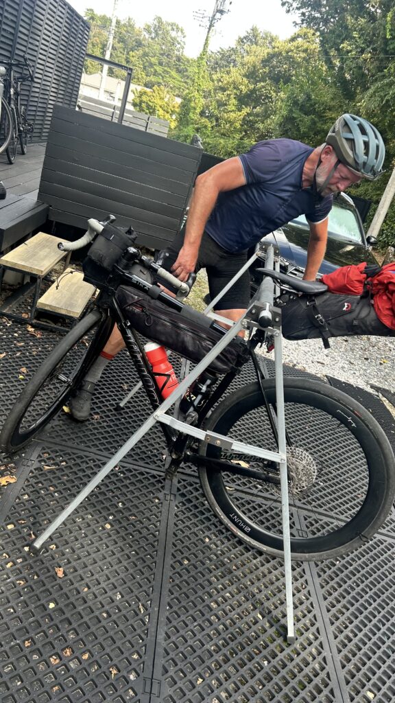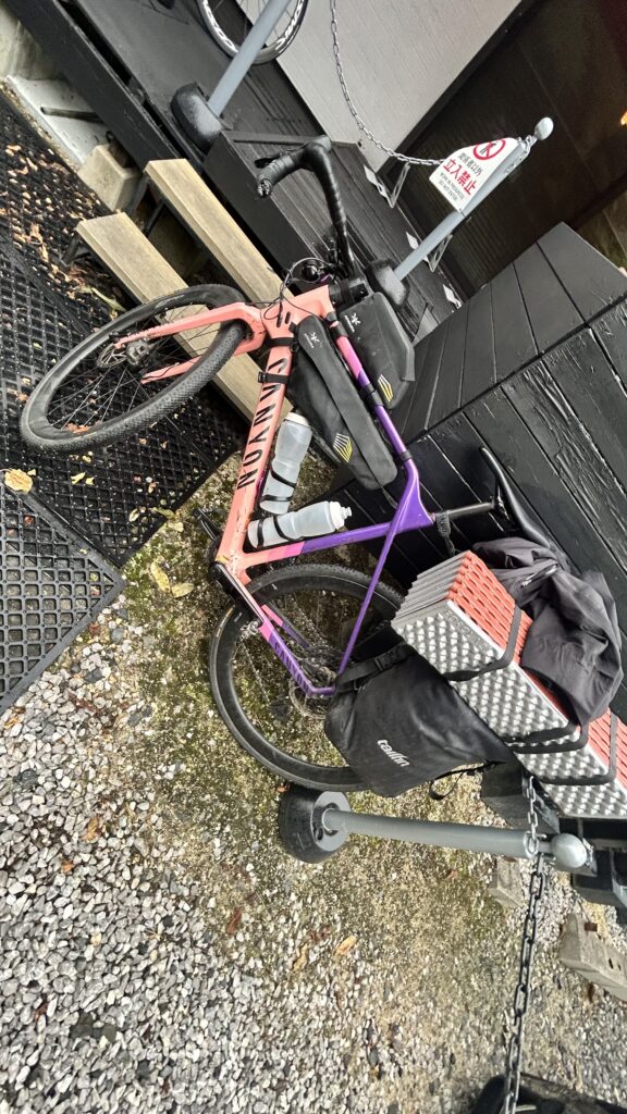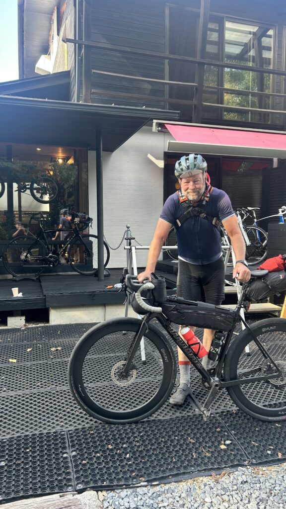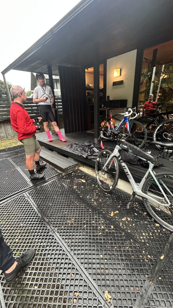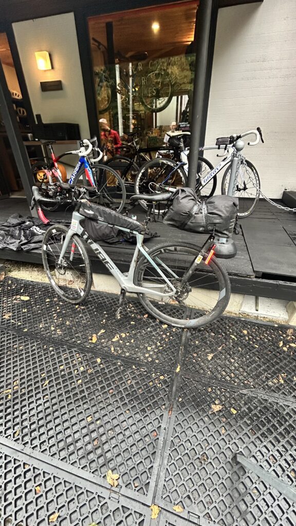 ロードバイクだけど40Cのタイヤが入るバイクはアメリカから来た65歳のライダーのバイク。太いタイヤは体に優しく私のような体力のライダーには最高だと。グラベルバイクじゃだめ?と聞いたら、太いタイヤは入るけど、ジオメトリーがオフロード用でアスファルトでは平地は進まないし、登りは全くだめ、だからロードバイクに40Cが入るFITONE SIKAはオーサムバイク!と嬉しそうに話してくれました。