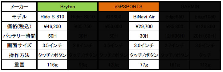 「iGP800」と「BiNave Air」の差は画面サイズ、バッテリー駆動時間がかなり変わり、価格差が¥23,300と大きな差があります。