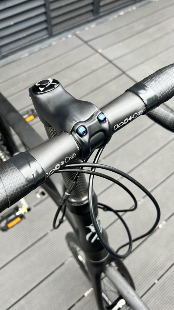 フレーム以外も、ハンドル、ステム、シートポストもカーボン。オプションでボルト類もチタン製に交換しています。
