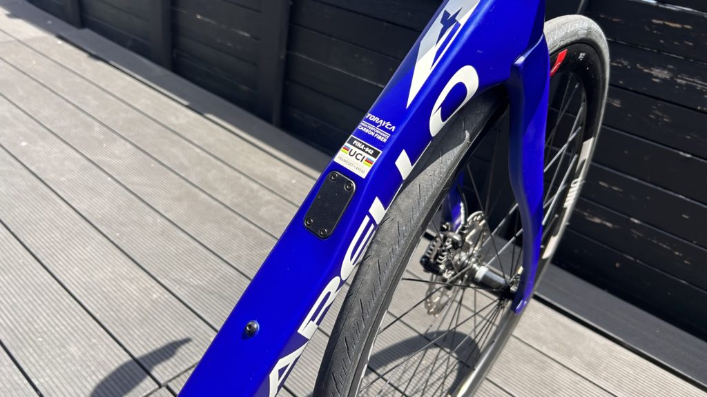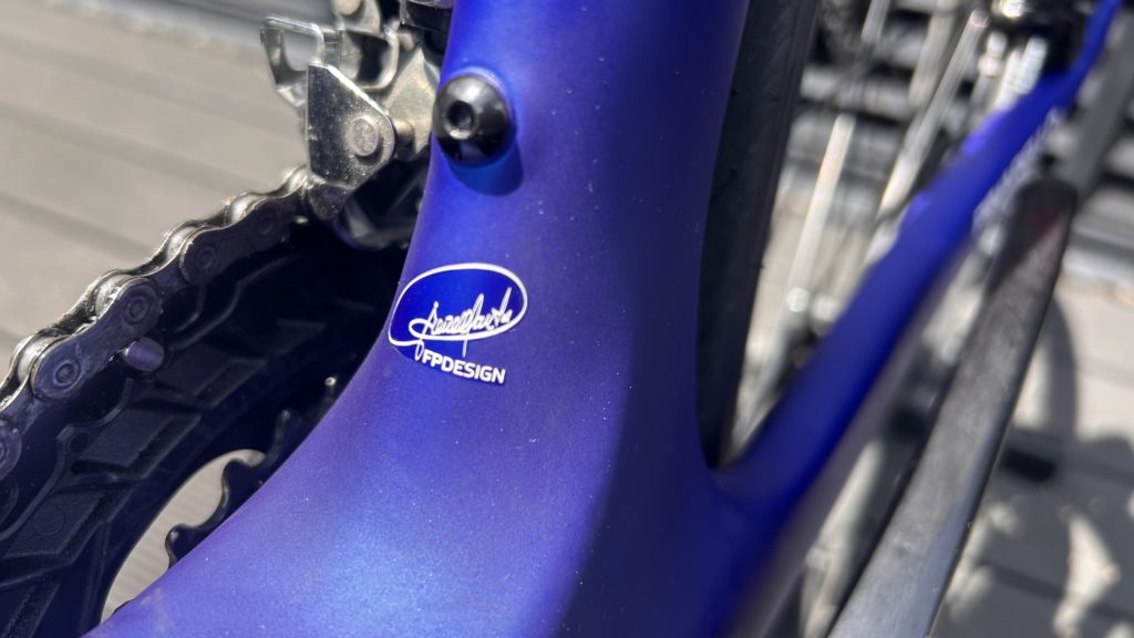 ダウンチューブの形状はボトルをつけた状態で空力が高まるようになっています。黒いフタは、ワイヤー変速仕様のシフトワイヤーなどが入っていくルートです。