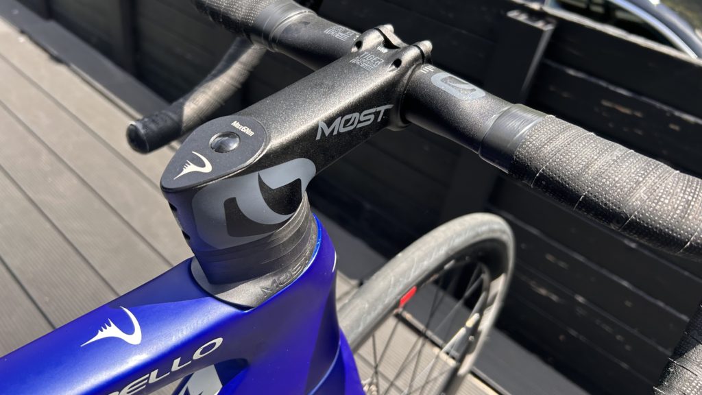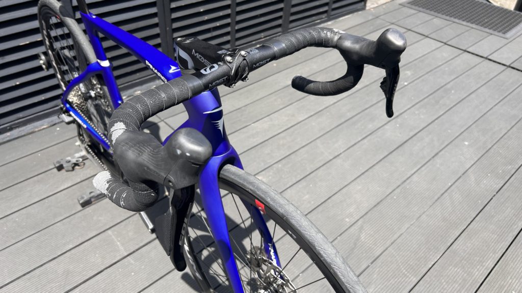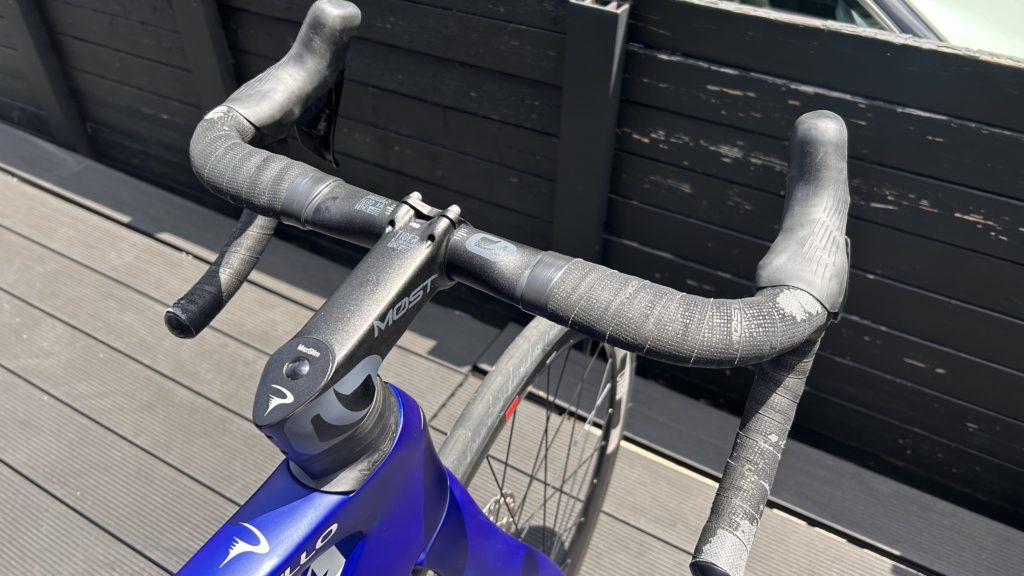 ハンドルはステムとハンドル別体型。ステムやコラムスペーサーも空力が高いエアロ形状。