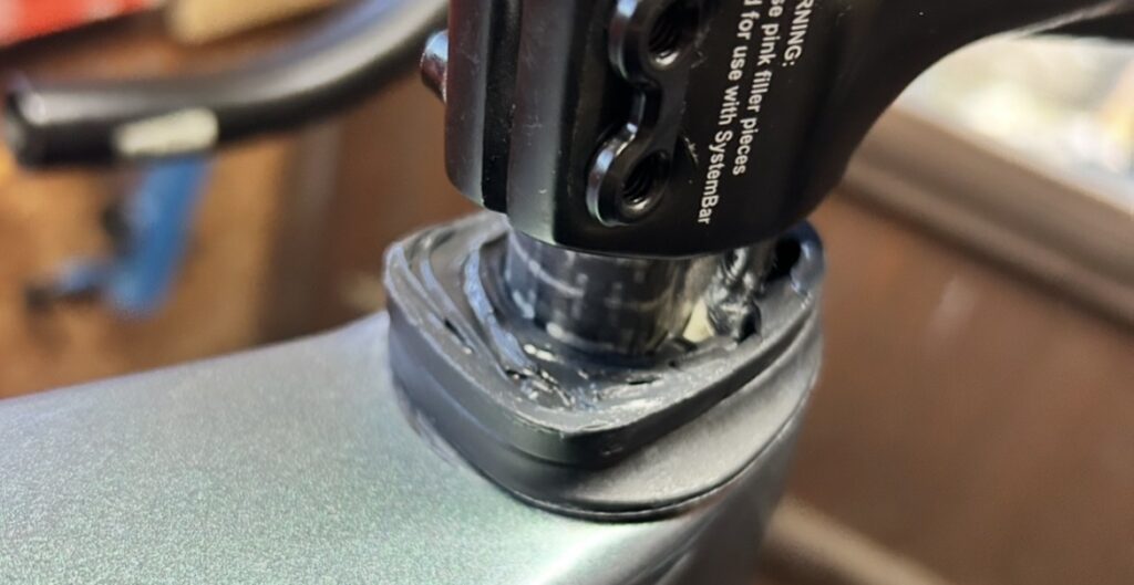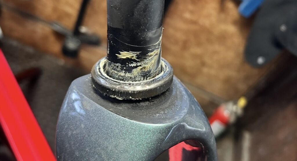 ハンドルを切る軸の所は雨や汗が入りやすく、錆びてベアリングが壊れやすい箇所ですうが、納車に塩害用グリスを入れていますので全く錆びていないのが次の写真です。